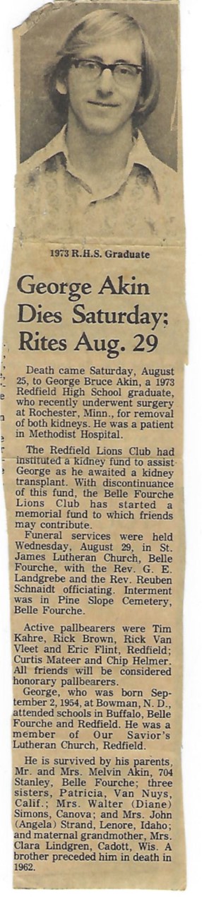 ![]() ![]() The following names are listed in the order they passed away. George Akin (1973) Sandy Stahl (1975) Randy Swedeen (1995) Cindy Durfee (1998) Pam Christiansen (1998) Brian Maher (2009) Dwight Friese (2011) Richard Herren (2012) Kevin Cranston (2013) Jackie Zens (2014) Bill Zahn (21015) Mary Todd (2018) Ione Stellmacher (2019) Dennis Becker (2020) Bonnie Seefeldt (2020) Cheryl Wernsman (2023) Heidi Smith (2023) David Dorsey (2025) ![]() ![]() ![]() ![]() May 1, 1995 I would like to express my love to the many people dear to me that shared the joys of my life. If I have neglected to express my love to anyone, I know my "Spirit" will always be in contact with you. I enjoyed my life and have no regrets thatI missed anything presented to me in my life, other than the people I haven't met yet in my life, and wish everyone to enjoy their life to the fullest. Randy Swedeen Randy was born March 28, 1955 in Sioux Falls, SD. He attended elementary and high school in Redfield, SD, graduating in 1973. He attended Northern State College in Aberdeen, SD for one year before moving to Enid, OK in 1975. He worked for Dowell Industries in Enid, OK for several years before attending Oklahoma State University completing a Bachelors Degree in Mechanical Engineering in 1980 and a Masters Degree in Engineering in 1982. Following graduation Randy went to work for Conoco Oil Company in Ponca City, OK. In 1992 Randy and a partner formed their own company, CETCON, specializing in environmental testing and process equipment analysis centered in Tulsa, OK. This venture was undertaken with his wife Judy A, (Williams) Sweden, whom he married on October 30, 1982 in Oklahoma City, OK. He is survived by his wife, Julia A., a son Erik Randall born December 23, 1992, and a daughter Kayla Ann born November 30, 1994. He is also survived by his parents Hollie Joel and Marjorie Ann Swedeen of Yankton, SD, two brothers Kendall Jay of Jackson, WY and Jeffrey Dale of Yankton, SD and one sister Marjo Ann of Overland Park, KS. He is survived by nine nephews and nieces who enjoyed his love and time. Randy passed away on June 8, 1995 at Tulsa, OK. "A LETTER FROM A MOTHER AND FATHER TO THEIR SON" Dear Randy, You left us so fast we did not have time to tell you how much we love you and how proud we are of you, not only for your accomplishments, but more important, how you lived your life. You loved your family, you loved your friends and you loved the person you needed to love. You were always for the "underdog", the handicapped and the elderly. You had friends from all over the world, from Iceland, Japan, Ethiopia, South America, etc. The world is a better place because of your life. Our only regret is that it was so short, but "God" has a divine reason for taking you home so soon. I don't know why "God" didn't take me instead of you. I could accept it better, but that is a selfish wish. "God" has his own reasons and we were not meant to understand his decisions, nor question them. Randy's life and death has brought us closer to "God". On the last day of his life, his wife, "Julie" ("God" bless her) said that the day was unusual. Little 6 month old Kayla slept most of the day. Little 2 1/2 year old Erik sat quietly watching TV all day, which was very unusual because he is a bundle of energy and motion (like his father at that age). Randy was not in any pain, which he had endured for over a week. He was serene and peaceful. In the middle of the afternoon he asked Julie if the TV was on in the other room because he heard voices. Julie replied that she did not hear anything. Randy said, "I hear voices, they are calling for me. They want me now.", then he died. Part of us died with him, but life goes on. Randy left a legacy of Love. We called him our blonde bear because he would always give us a bear hug when he greeted us or said good-bye. The last bear hug he gave me was when he knew he was going to die. As we embraced we accidentally bumped noses. I will treasure this memory until the day I die. Some Day we hope to meet Randy and our family members and friends if we are worthly of this honor. We know we are going to try harder to become better Christians. With all our Love, Dad and Mom P.S. We are grateful that "God" let us have you for forty years. ![]() Cindy Durfee was born in Miller, South Dakota to Alvin and Eleanore Durfee on December 17, 1954. She graduated from Redfield High School in May 1973. Following high school graduation, she attended Minnesota Business College in Minneapolis and graduated in 1975 with honors. Cindy worked at Midwest Federal Savings and Loan and later at the Fort Snelling Veterans Regional Office, both in Minneapolis. Cindy got married in Minneapolis and returned to Redfield shortly afterwards, working at Ken's Super Value, before moving to Cogswell, North Dakota for a short time, and then returning to Redfield. After living in Redfiled for a few months, Cindy decided to continue her education and attended Northern State College for two years, and therefor moved to Aberdeen, South Dakota. She worked at Hub City Division of Safeguard Industries as a computer trainer. Due to health problems, she had to discontinue working. Cindy enjoyed collecting Walt Disney and Looney Toons memorabilia, and also had a collection of Snow Globes. Cindy passed away due to lung cancer on June 10, 1998 at the age of 43. She is survived by her mother Eleanore of Refield; her brother Dave of Redfield; and her two daughters, Kristy and Jessica of Aberdeen. ![]() Pamela Joy (Christiansen) Seidschlaw died in August of 1998 at the age of 43 from complications due to Marfan Syndrome. Until that time, she and her husband, Loren, lived on their farm near Wecota, SD. In addition to raising two daughters (Stefanie and Krista), Pam worked at the Ipswich Tribune for a time, then the Faulk County Conservation District until her retirement in 1996 due to her health. Stefanie 30, lives in Coumbia, Missouri with her husband, Dr. Stev